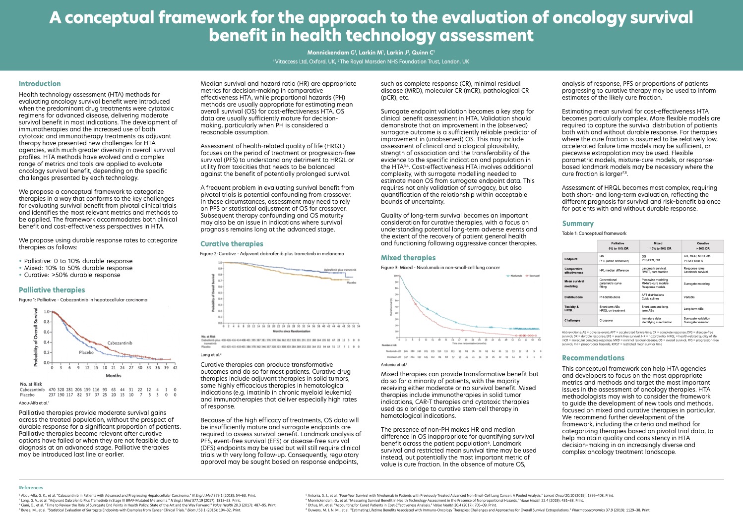 HTA methods for evaluating oncology survival benefit were introduced when most drug treatments were cytotoxic regimens for advanced disease, delivering moderate survival benefit. Immunotherapies now offer the potential for transformative benefit in many indications. Adjuvant drug therapies with curative intent in earlier disease stages are also expanding. The increased diversity in survival benefit delivered by new technologies adds complexity and presents new challenges for HTA evaluation of oncology therapies.